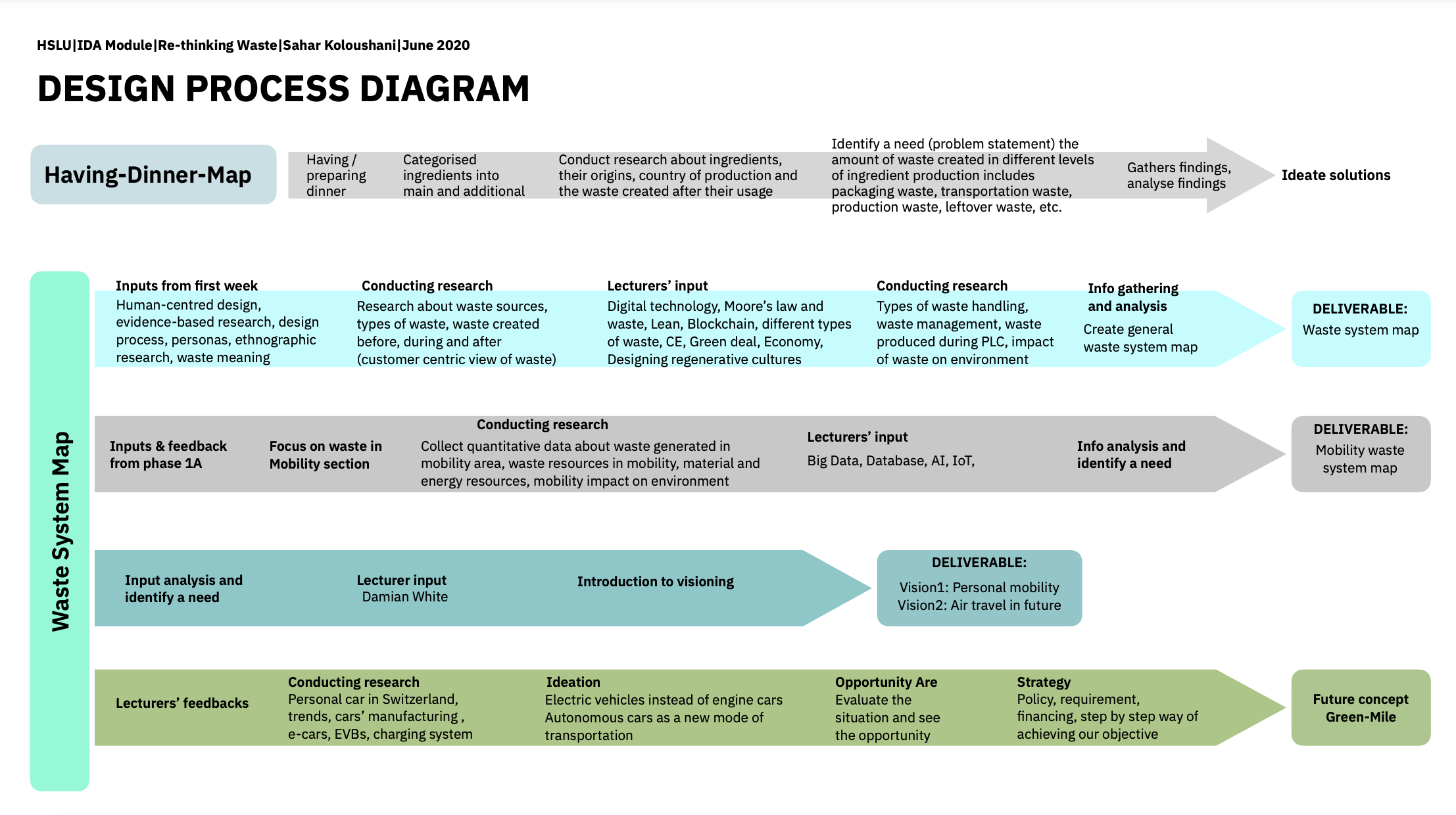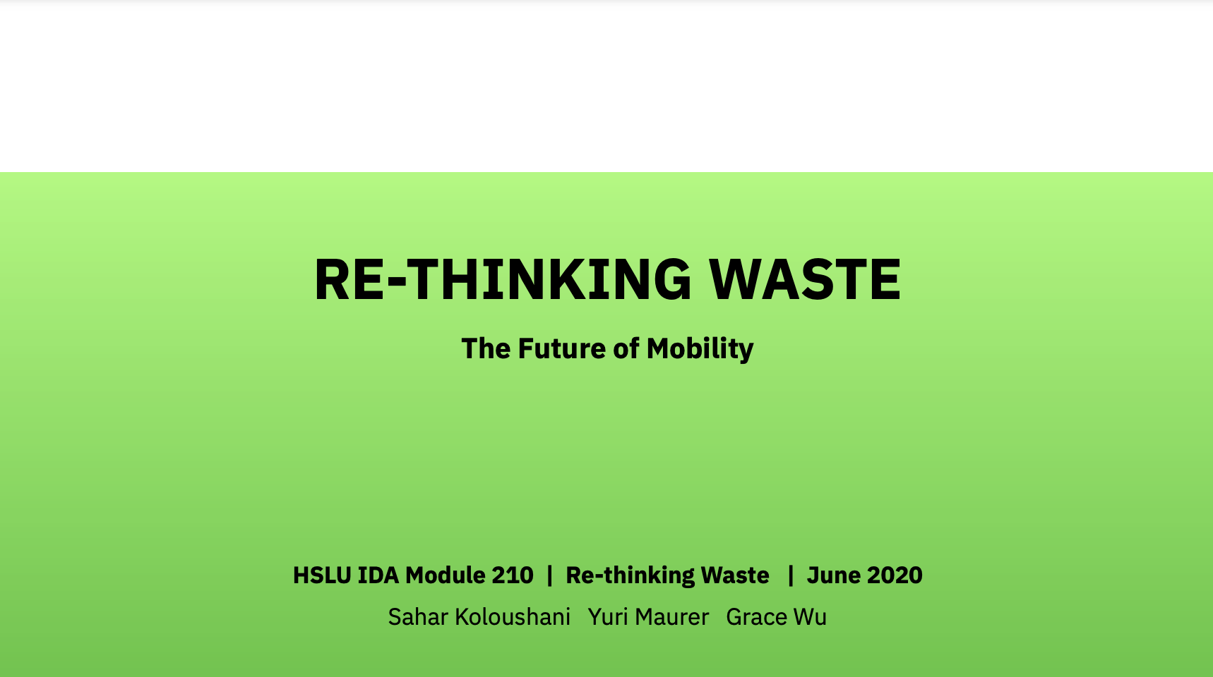In this Project, through a design process, at first, a waste system map has been generated. Conducting research about waste sources, types of waste, waste created before, during, and after (customer-centric view of waste) consumption, types of waste handling, waste management, waste produced during PLC, and the impact of waste on the environment lead me to create a general waste system map. Furthermore, by focusing on waste in the mobility section and collecting quantitative data about the waste generated in the mobility area, waste resources in mobility, material and energy resources, and mobility impact on the environment we made a mobility waste system map and identified a possible need in the future of mobility. Eventually analysis of input and identify the need leads us to ideate electric vehicles instead of engine cars and Autonomous cars as a new mode of transportation. Finally, we evaluated the situation and see the opportunity in Switzerland and the required policy, requirements, financing needs, and steps to achieving our objective.