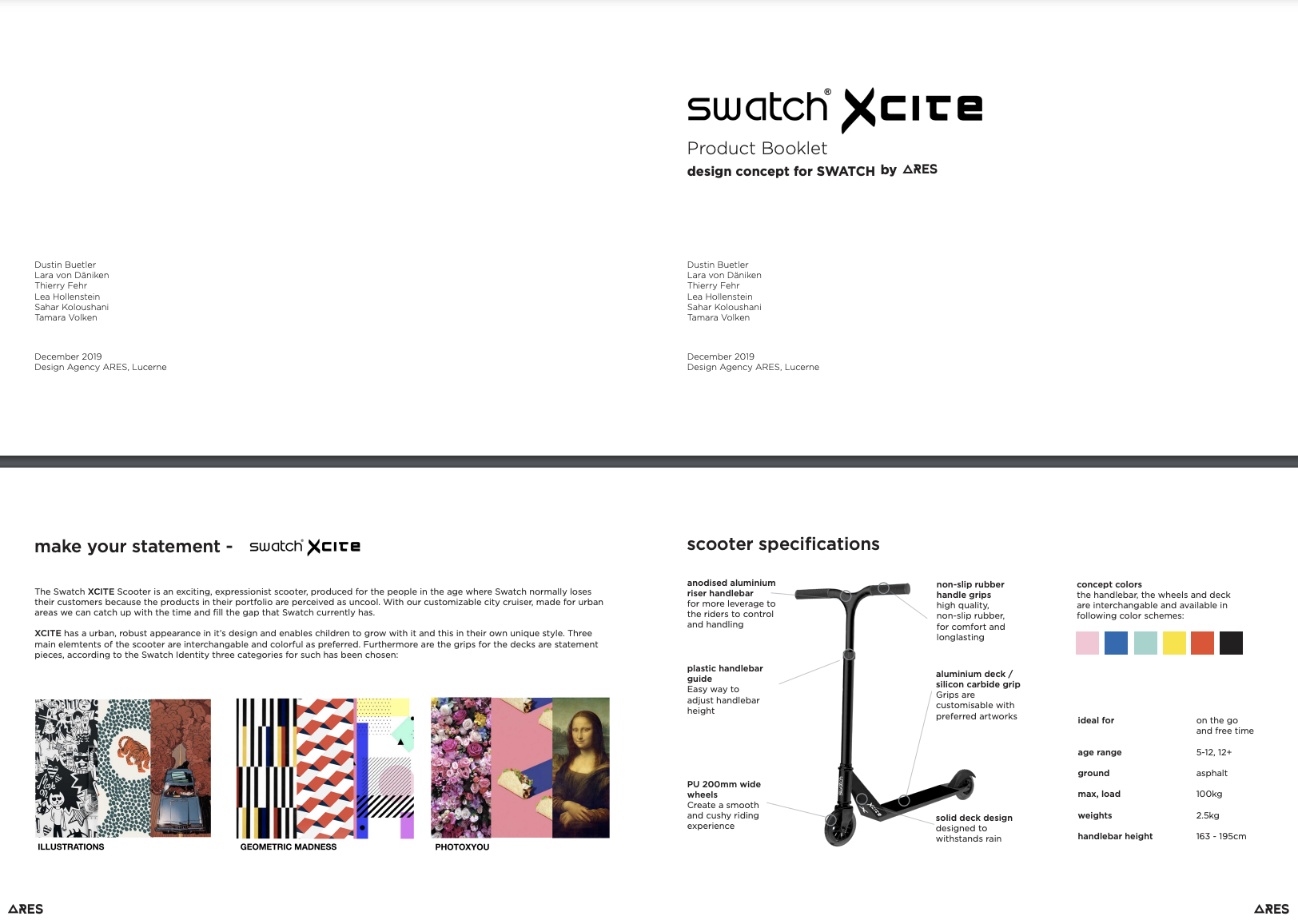 “swatchXcite” is a personal mobility solution for the brand Swatch, answering the following problem statement: “How can children experience personal mobility in a fun, expressionist and reliable way?”. The product comes in the form of a scooter called “swatchXcite” and addresses a young, self-confident and expressionist target group, typically girls and boys between five to nine years old that do not consume the Swatch collection “FlikFlak” anymore and seek a gadget that is cooler and more modern. SwatchXcite satisfies that need and is characterized by its bold, colourful, expressionist design while promising comfort and highest safety standards, and offering a wide range of choices in individualising the product. The product will be launched on the market in three steps; first addressing the parents (customer), then raising interest among children (consumer), and finally appealing to both, the customer and the consumer. The customer journey involves digital as well as physical touchpoints, based on the audience and the campaign’s objective.